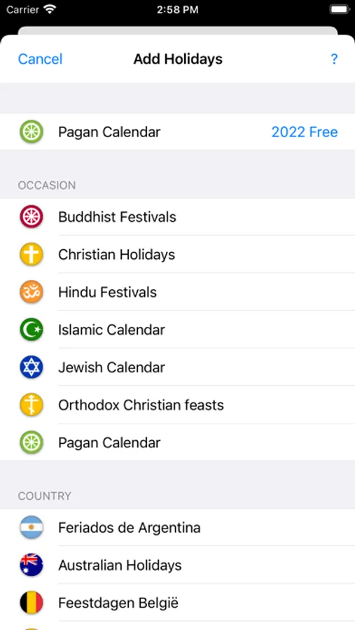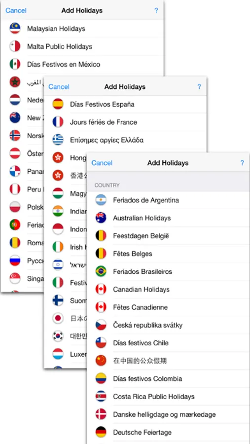 Insert the holidays of the countries listed below into your iPhone calendar with one tap. The holidays will be added as all-day events, you don't need any subscriptions. You can also select beforehand which holidays you want to add to your calendar, and apply this selection across all years. Saves you a lot typing for the upcoming years!