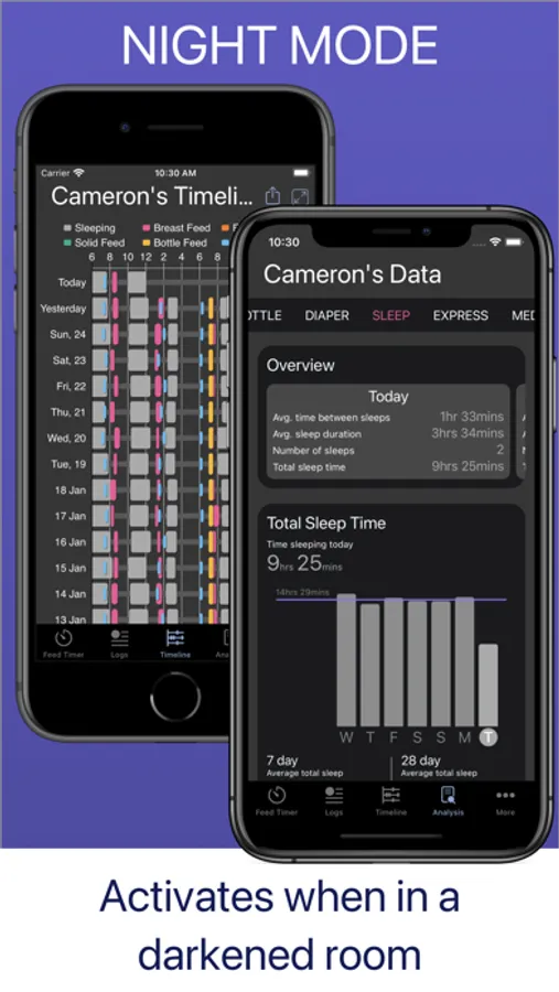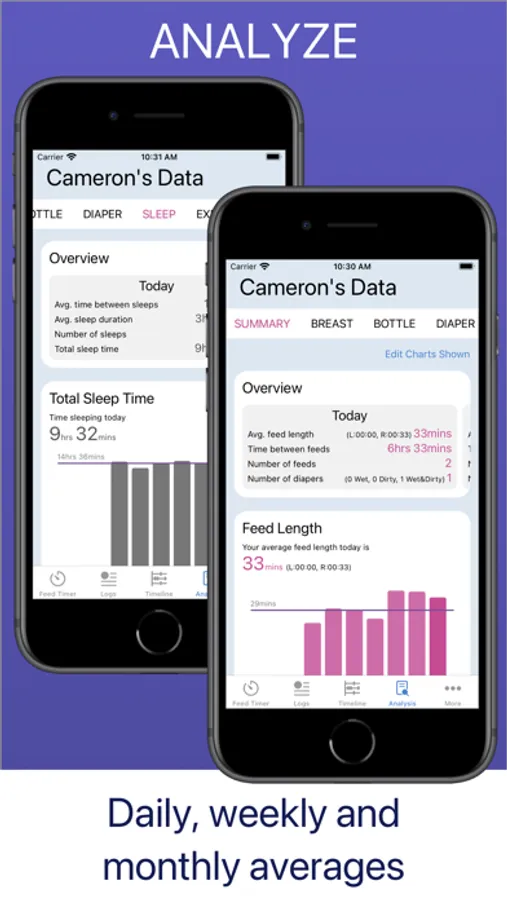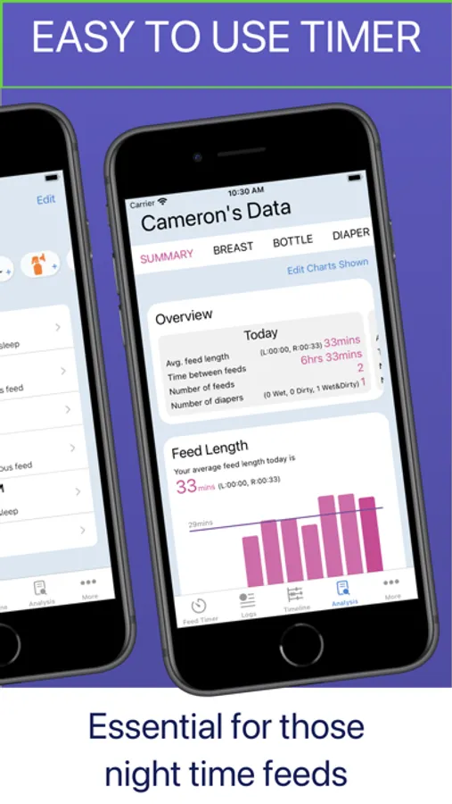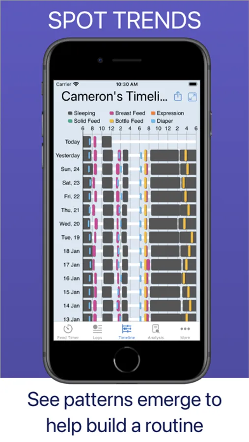 √ Easy to read charts displaying analyzed data, as well as a timeline view so you can see emerging trends, such as baby feeding or sleeping at the same time every day. This also helps to show days when baby is acting differently such as more dirty diapers than usual