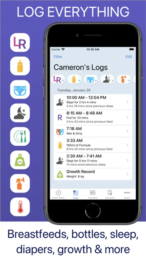 √ Log breastfeeds, bottle feeds, breast pumps, diapers, sleep, solid food, baby's weight, baby's length, medication, make notes and set reminders