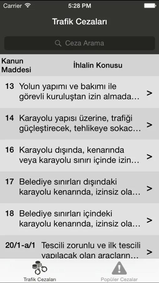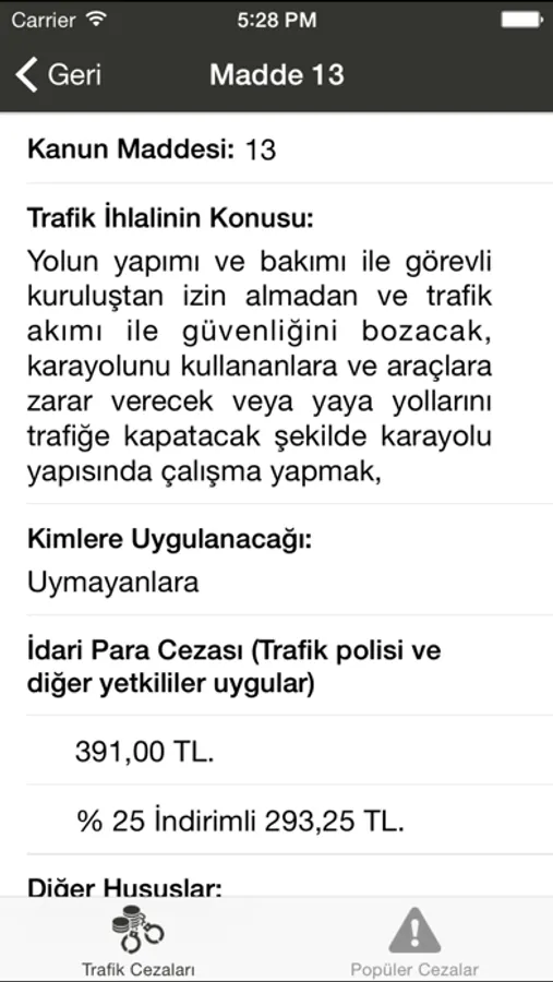 Hiçbir bağlantıya ihtiyaç duymayan yapısı, kolay kullanımı ve kullanıcı dostu tasarımıyla, alanında Türkiye’nin en çok indirilen uygulaması olan “Trafik Cezaları” uygulamamız, 2015 ceza listesiyle daha kullanışlı.