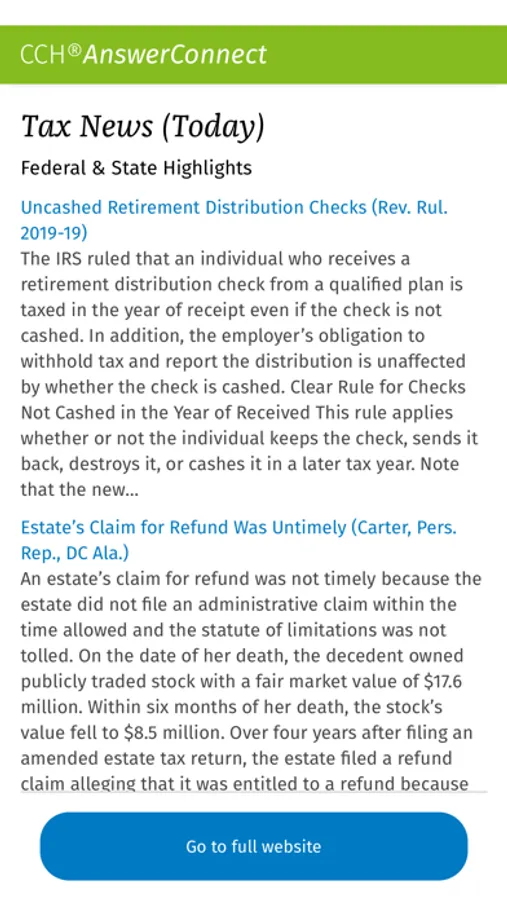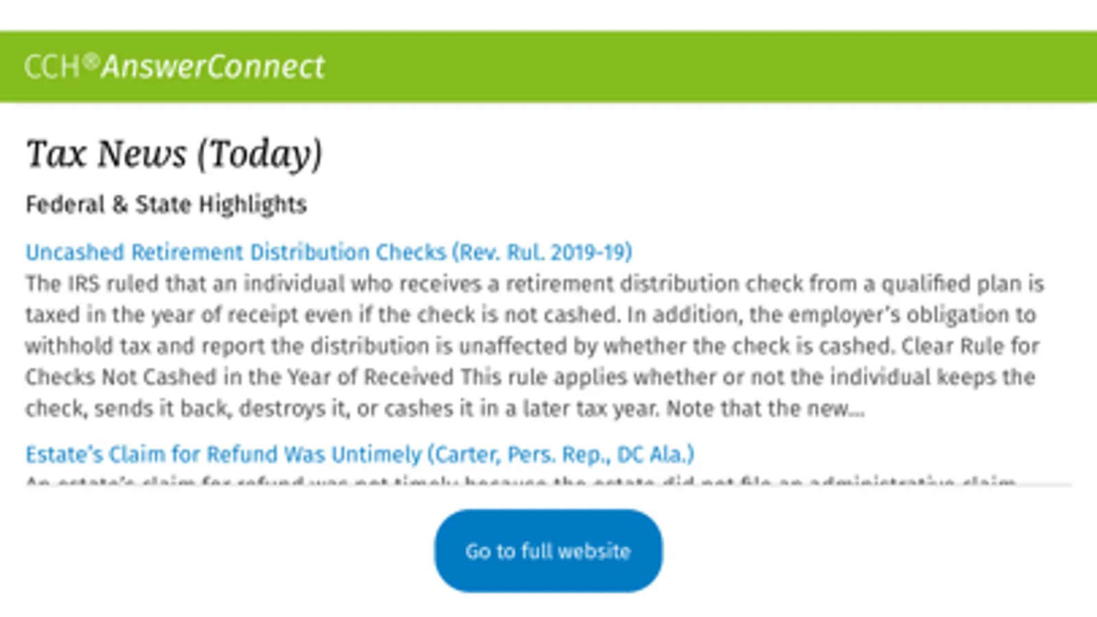 CCH Mobile ensures you stay ahead of the competition by providing the latest Federal and State tax news headlines and unprecedented access to the industry’s best content. Whether you are at a client’s office, commuting on public transportation or at your child’s soccer game, CCH Mobile delivers immediate access to the information you need to stay up-to-date on the ever-changing world of tax laws and regulation.