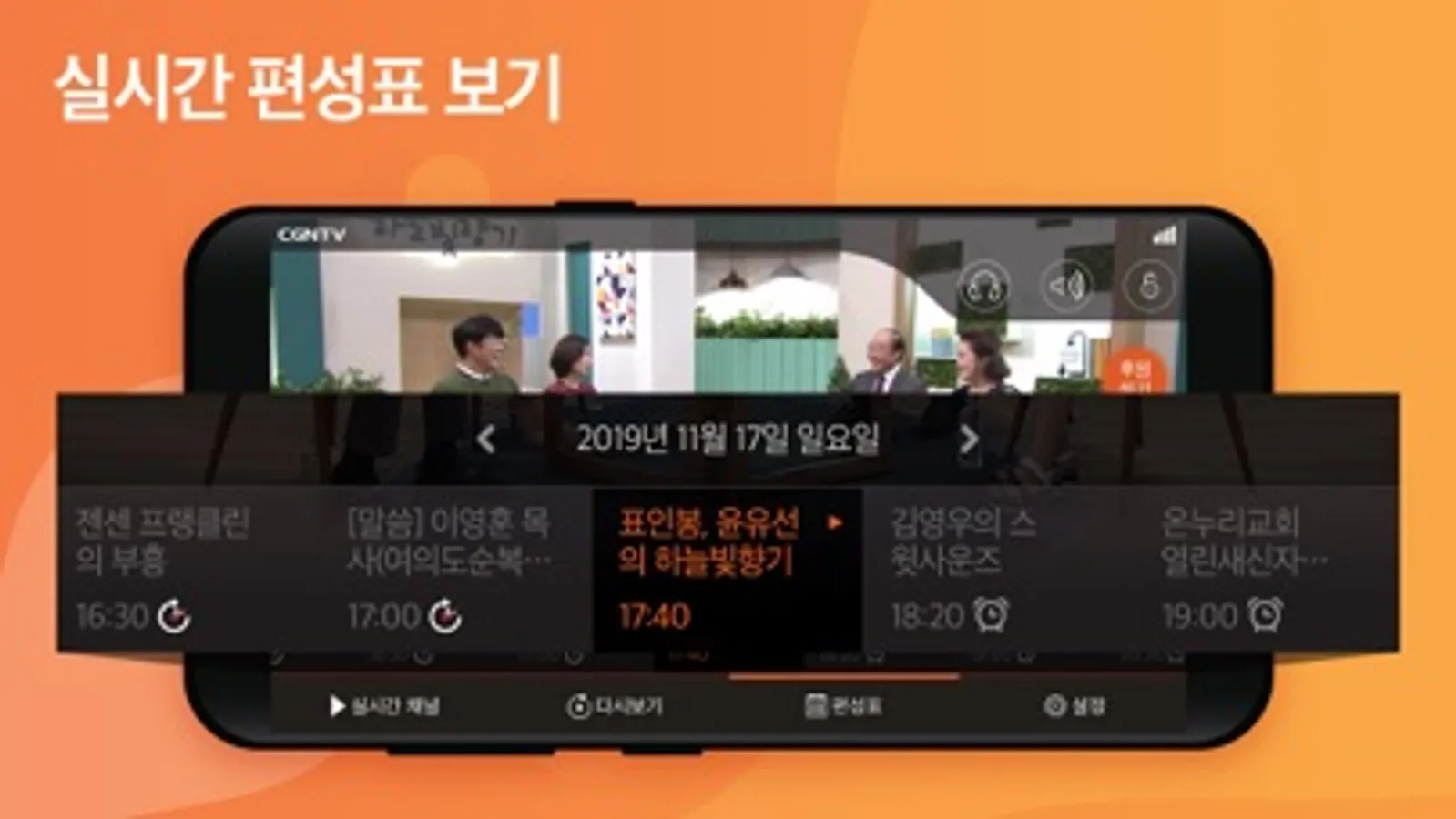 4. 편성표 : 편성표에서 다시보기 아이콘을 클릭하면, 지난 영상을 볼 수 있습니다. 알람을 설정하시면 라이브앱을 꺼두셔도, 편성 시간에 맞춰 알림 화면이 뜹니다.