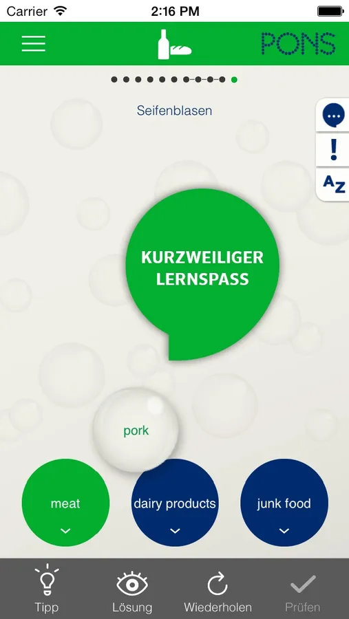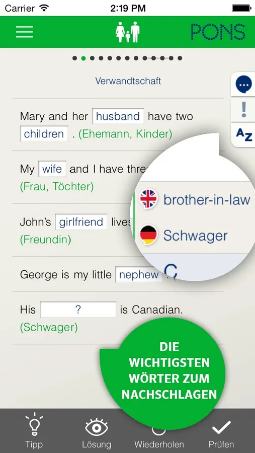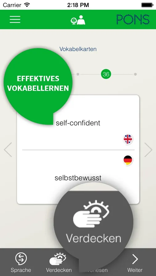 Mit der Möglichkeit eine Seite zu verdecken, trainieren Sie Ihren Wortschatz effizient und schnell.