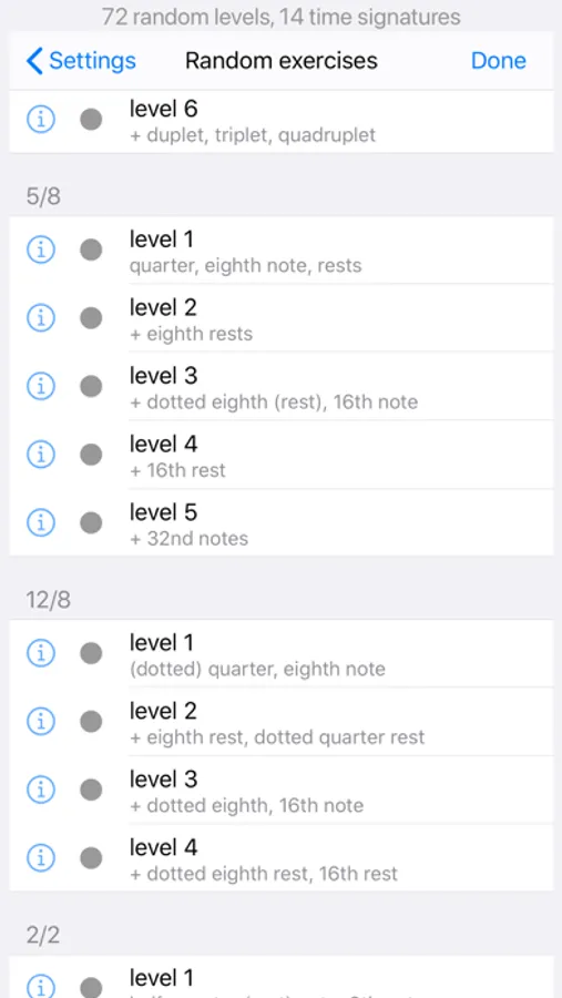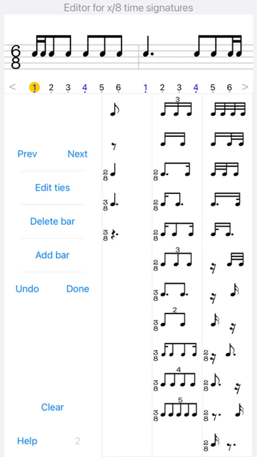 - Common and rarer rhythms from 2 to 12 beats per bar (2/2, 3/2, 4/2, 2/4, 3/4, 4/4, 5/4, 6/4, 7/4, 3/8, 5/8, 6/8, 7/8, 9/8, 12/8).