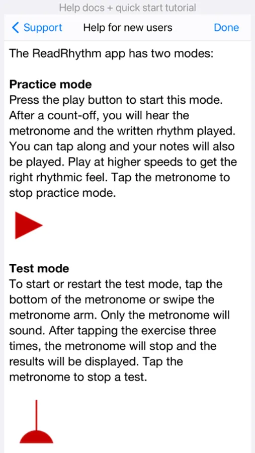 - Test mode: you hear the metronome and must read and tap the rhythm.