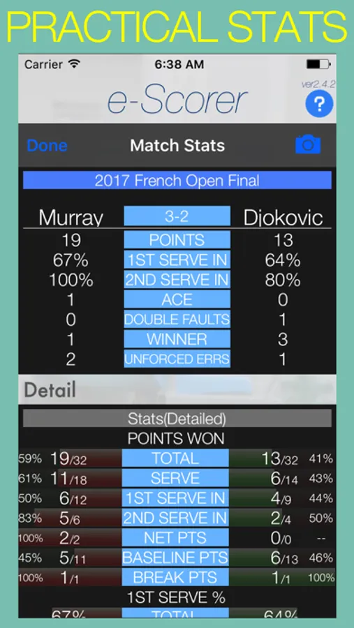 - "Match Stats" tab → shows your SERVE%, Point Share% in one screen. you can also save the stats as a image by clicking the camera icon.