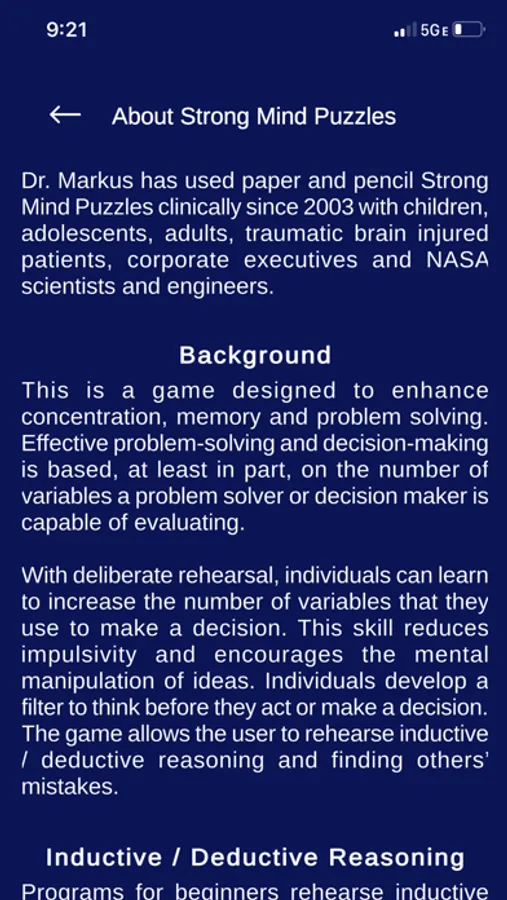 Strong Mind Puzzles is a game designed to challenge your brain. In her 35 years of cognitive restructuring practice, Dr. Markus created a series of paper-and-pencil puzzles to explore new ways to challenge the brain and rehearse cognitive abilities. To reach beyond her clinical practice, these puzzles were converted to a mobile format which provide numerous, varied opportunities for learning.