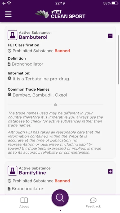 You must be aware that the list of trade names is not exhaustive but it reflects the most common trade names in various countries. The trade names used may be different in your country. Therefore it is imperative you always use the database to check for active substances rather than trade names. Although the FEI has taken all reasonable care that the information contained within the website and mobile application is accurate at the time of publication, no representation or guarantee (including liability towards third parties), expressed or implied, is made as to its accuracy, reliability or completeness.