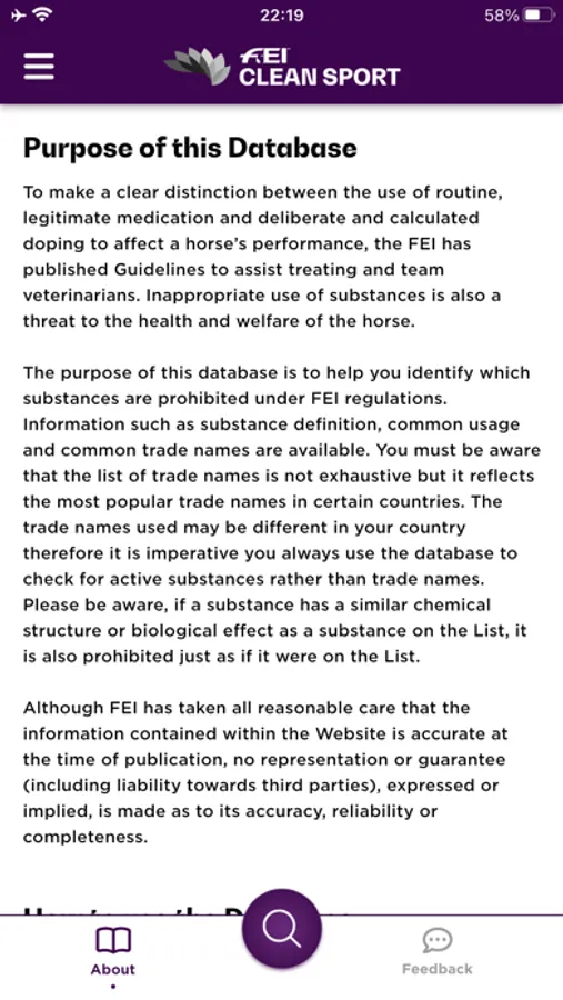 The purpose of the FEI Prohibited Substances Database is to make a clear distinction between the use of routine, legitimate medication and deliberate and calculated doping to affect a horse’s performance; the FEI has published guidelines to assist treating and team veterinarians. Inappropriate use of substances is also a threat to the health and welfare of the horse. The purpose of this database is to help you identify prohibited substances under FEI regulations. Information such as substance definition, common usage and common trade names are available.