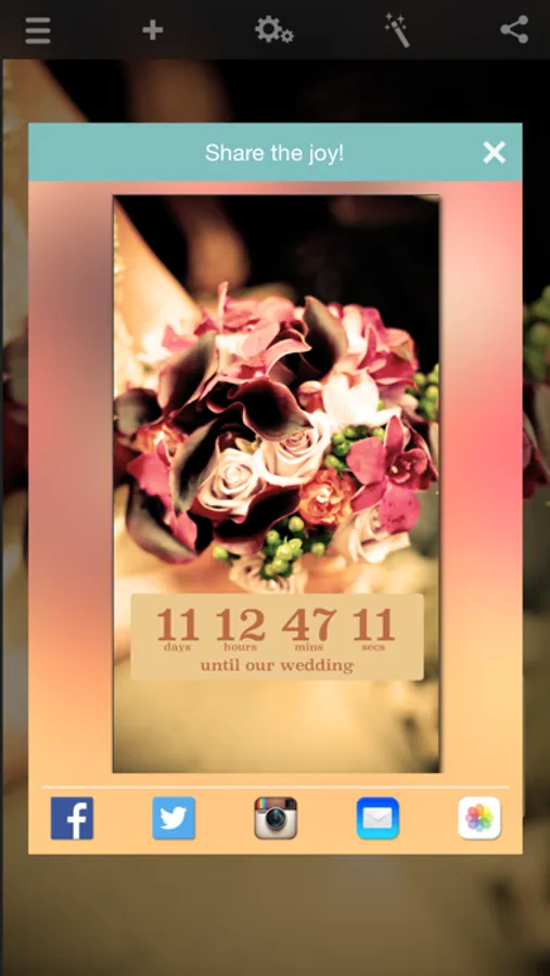 • SHARE a live Countdown or a screenshot of your Countdown with FACEBOOK, INSTAGRAM, TWITTER or EMAIL.