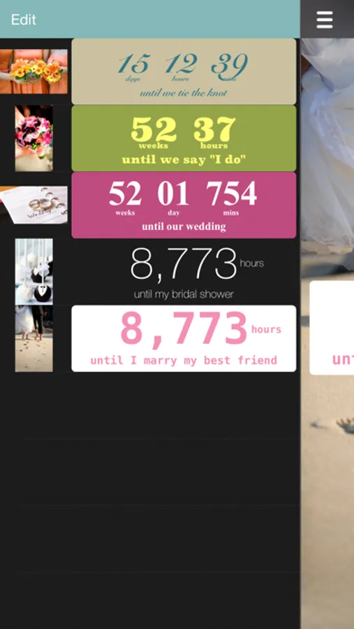 + MULTIPLE countdowns - bridal shower, pre-wedding party, the wedding day - count down to all of them and order them in the way you like.