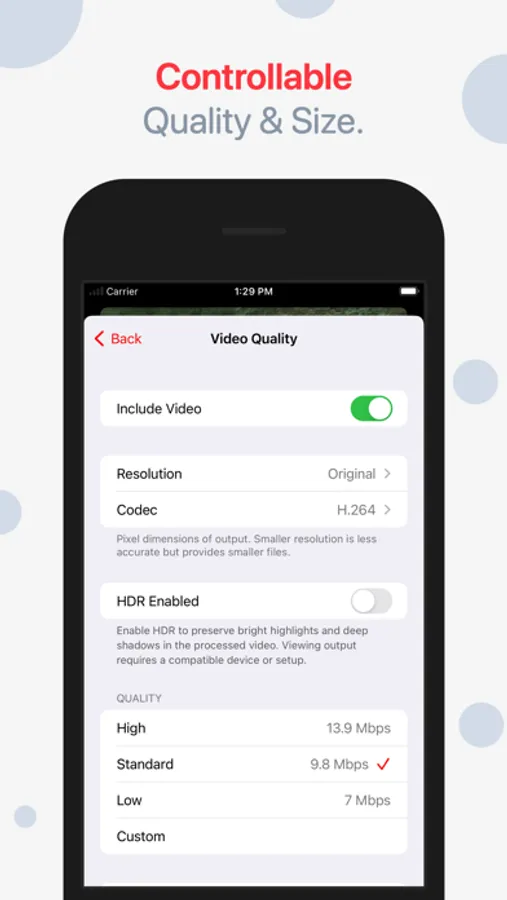 • Fully exposed video encoder: format (mov, mp4, m4a), codec (H.264, HEVC), quality/bitrate, resolution to customize output (smaller size or better quality).