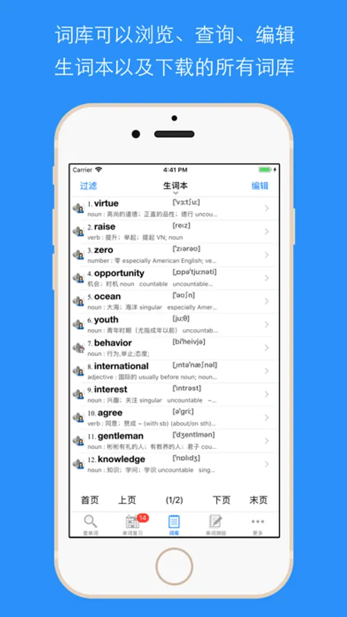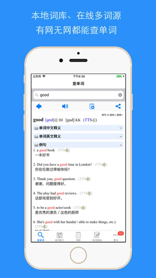 1. The software itself contains a large number of local vocabularies (including the real pronunciation vocabulary), and is constantly increasing. Local offline can search commonly used words, multiple phonetic symbols, live voices, Chinese and English explanations, example sentences, and so on.