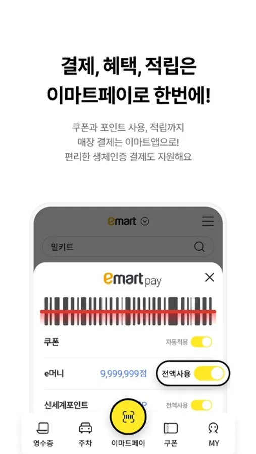 바코드 하나로 신세계포인트 적립과 e머니 및 쿠폰 사용, 그리고 스탬프 발급까지 한번에!