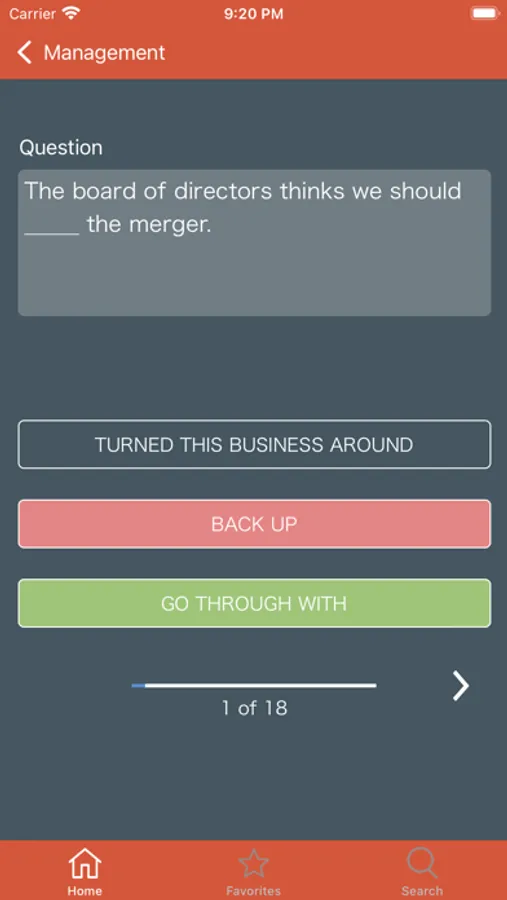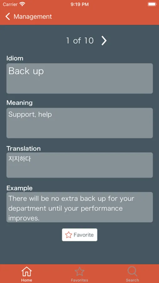Office Idioms also provides a 'Favorites' function which allows the user to save a specific idiom to a separate 'Favorites' section for quick referencing and later studying.
