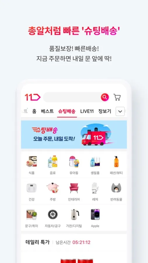 - 오늘 자정까지 주문하면 내일 문 앞에 도착하는 슈팅배송
