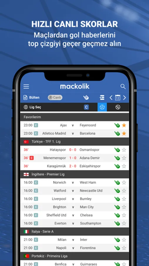 Seçtiğiniz takımlardan, favoriye aldığınız maçlardan haberdar olun. Golleri, kırmızı kartları, devre sonu ve maç sonu skorlarını anında öğrenin. Ayrıca artık favoriye seçtiğiniz maçlarda ilk yarılarında ve maç sonlarında ne kadar uzatma oynanacağını da takip edin.