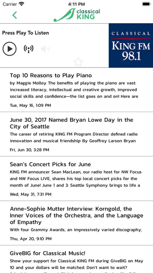 Founded in 1948, Classical KING FM ranks as one of the top 5 American classical radio stations. The listener-supported public radio station serves the Pacific Northwest community and a global audience with on-air and online programs that enrich, enlighten, and showcase the Pacific Northwest arts community to the world.