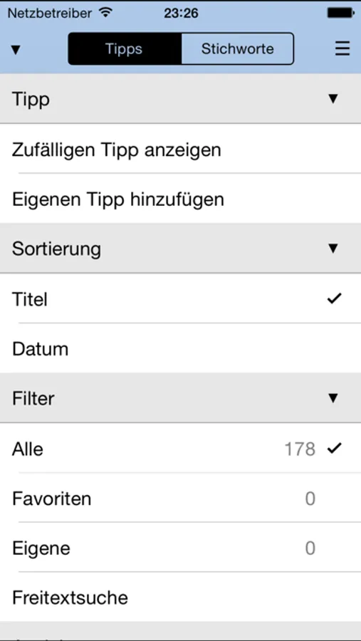 Die Tipps lassen sich über Stichworte und eine Freitextsuche einfach finden. Lassen Sie sich über die Zufallsfunktion inspirieren. Markieren Sie Tipps als Favoriten; diese lassen sich über einen Filter besonders schnell wiederfinden. Einzelne Tipps können Sie per Text und E-Mail an Freunde & Bekannte versenden.