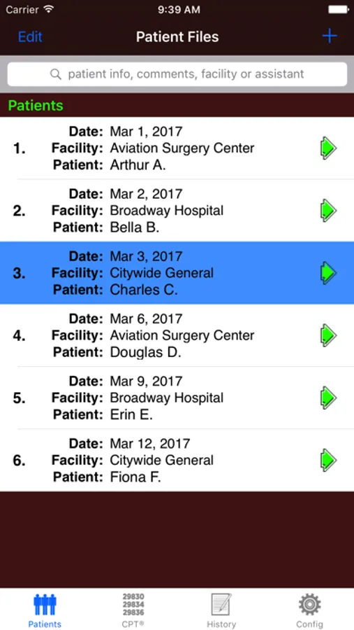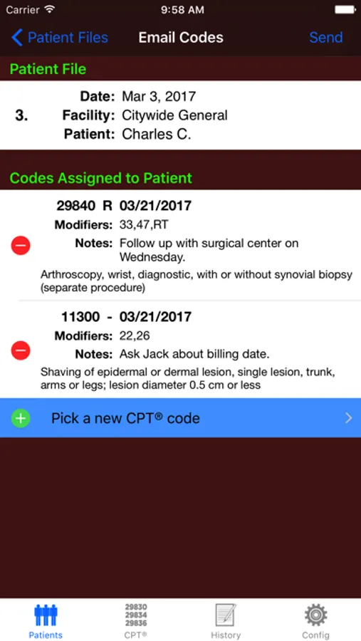 A full procedure report containing all patient identifying data, plus CPT® code(s), surgical assistants, location and date of surgery can be emailed directly to your biller or any email address from within the App. Patient procedure details can be logged and stored for handy future use. Residents and anyone collecting cases for research or board recertification should find this useful.