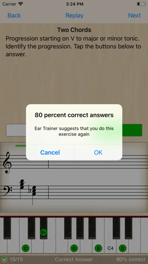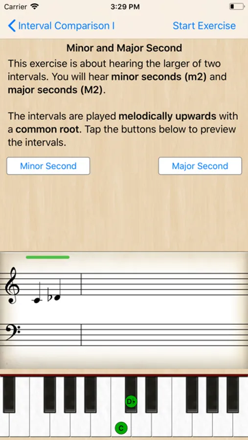 Each exercise has a short description of its purpose and optional preview. A virtual piano keyboard in each exercise helps you visually understand and analyze the notes that have been played. To aid your progression you can compare the different options after answering. (You can even play the virtual piano if you like!)