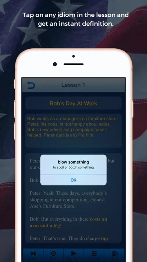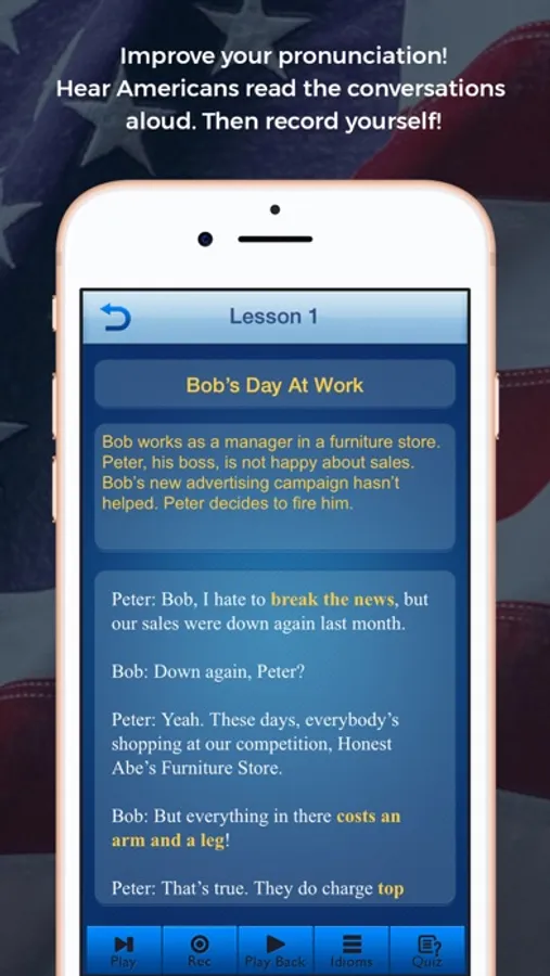 What's the secret to speaking English better? It's mastery of those tricky idioms and phrases that are so common in English. And learning these idioms and phrases will not only help you speak better, it'll help you understand Americans better. In this app, you'll join an American family as they go about their day-to-day lives. Along the way, you will master over 300 of today's most common English idioms and expressions!