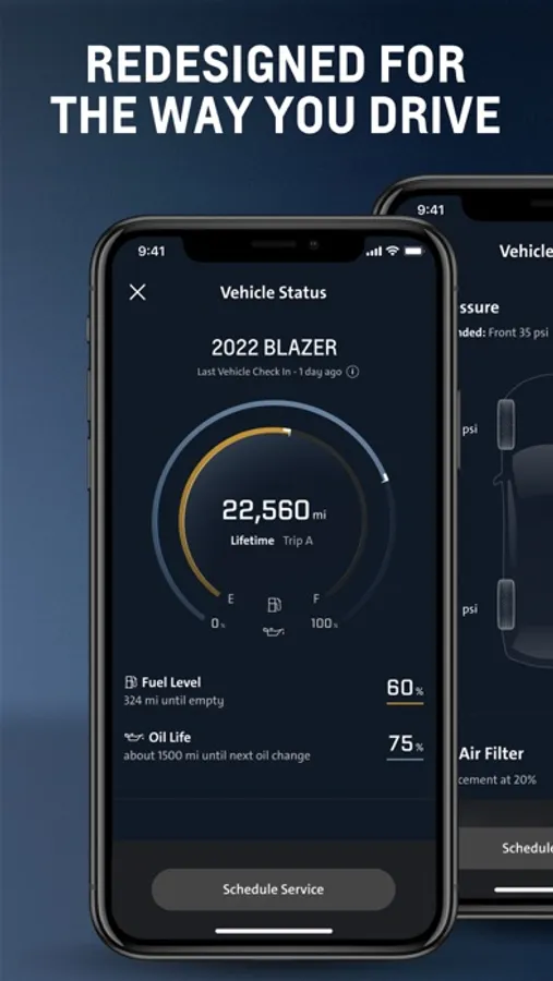 Check your vehicle’s status to monitor fuel level, oil life, tire pressure and more, making it easy for you to stay on top of your vehicle’s health and schedule service with your participating Dealer without leaving the app.