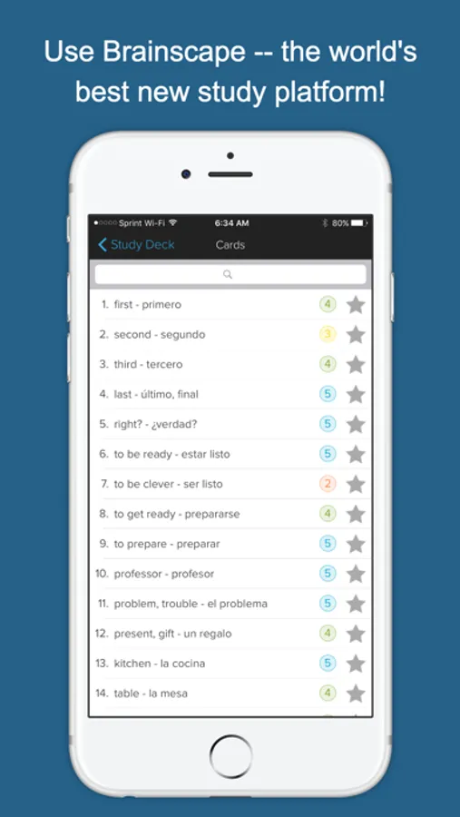 Drill yourself on the most common vocabulary words from your Spanish courses and from everyday Spanish conversation. Boost your vocab FASTER than with any other app on iTunes. Applying the latest in cognitive science, Brainscape introduces vocabulary words in order from most foundational to most complex, and repeats them in a pattern that is just right for YOUR brain.