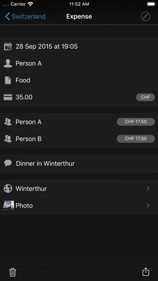 Use Expense Tool, create an expense set and start entering your data. Your expenses can be listed, shown on a map, exported by email, printed and transferred to another iOS device. If more than one person is part of an expense set, you get a summary showing the total of all individual expenses and the balance of the shared expenses.