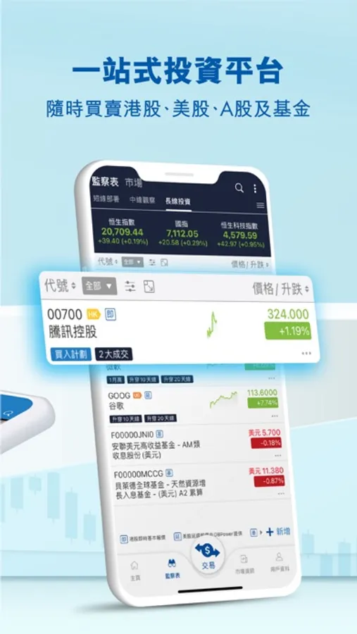 ● Real-time Quotes: Free real-time quotes service applicable to HK and US and stock markets, offering customized Stock Portfolio Watchlist and Live Broadcast functions,