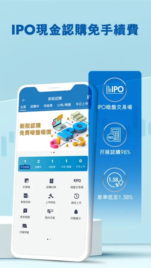 ● IPO Subscription: Enjoy IPO subscription service with handling fee waiver and low margin securities interest rate. We provide a professional streaming quotations and charts of IPO grey market, allowing you to receive the latest market trends with real-time tracking and push notification