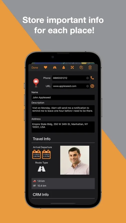 For each place added to your trip, you can enter information such as - names, descriptions, arrival and departure times, contact details, notes, and more.