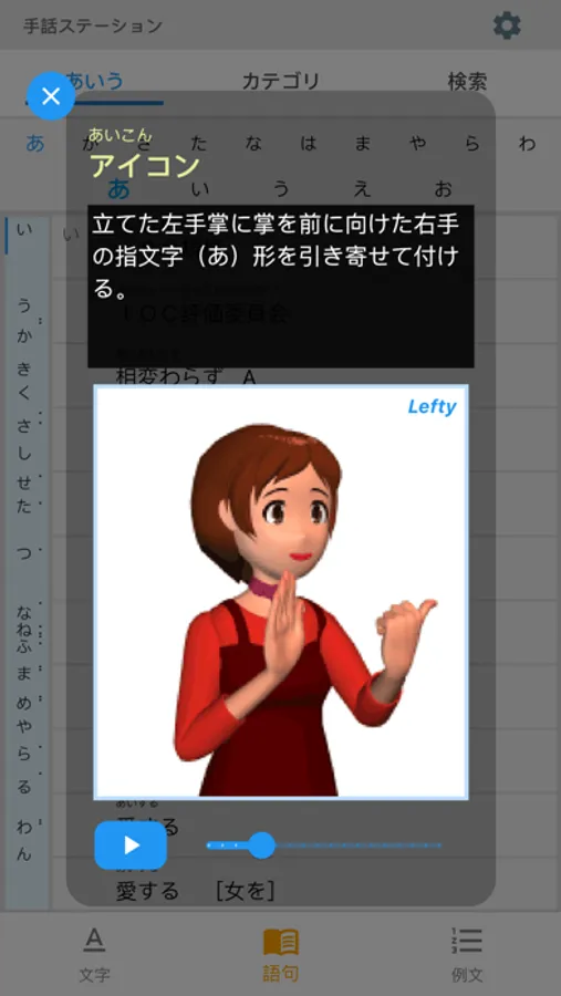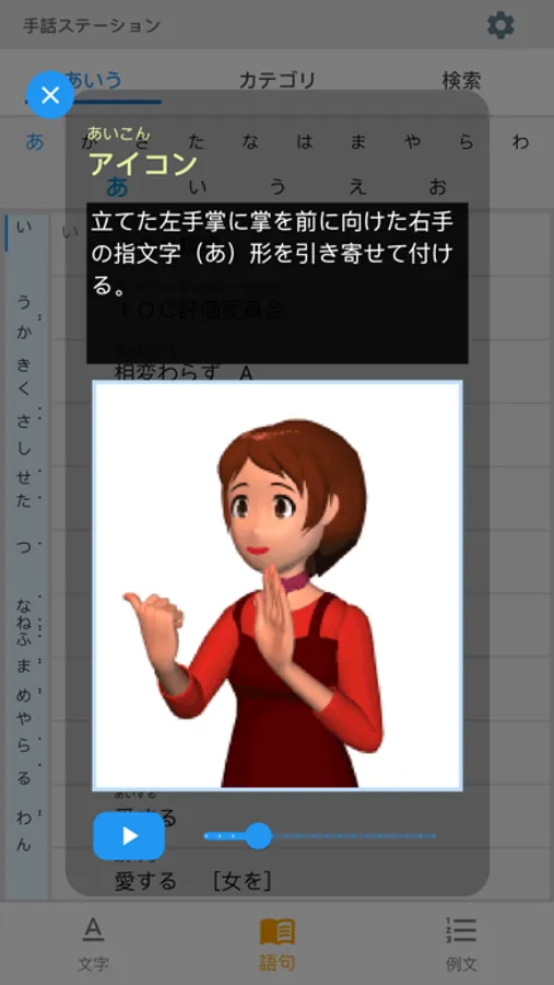 表示画面はできるだけ大きくアニメ表示し、その表現由来や動作指示などの説明を加えました。手話辞書として活用するだけでなく、表現の意味を理解しながら効果的に手話を習得することも可能です。