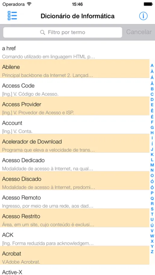 Conheça os significados daquelas palavras que estão sempre no nosso dia a dia, mas muitas vezes não sabemos o que elas querem dizer. Este rápido aplicativo coloca em seu iPhone/Ipod milhares de palavras relacionadas a informática. Indicado para todos os públicos, não somente aqueles dedicados na área de tecnologia. Exemplo disso é o uso de vários destes termos em "pegadinhas" de concursos públicos, onde informática hoje é considerada como disciplina eliminatória de vários concurseiros, inclusive os mais estudiosos.