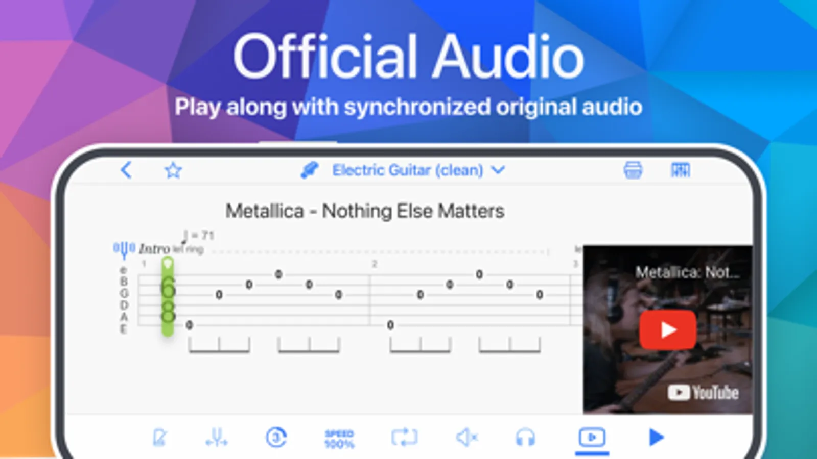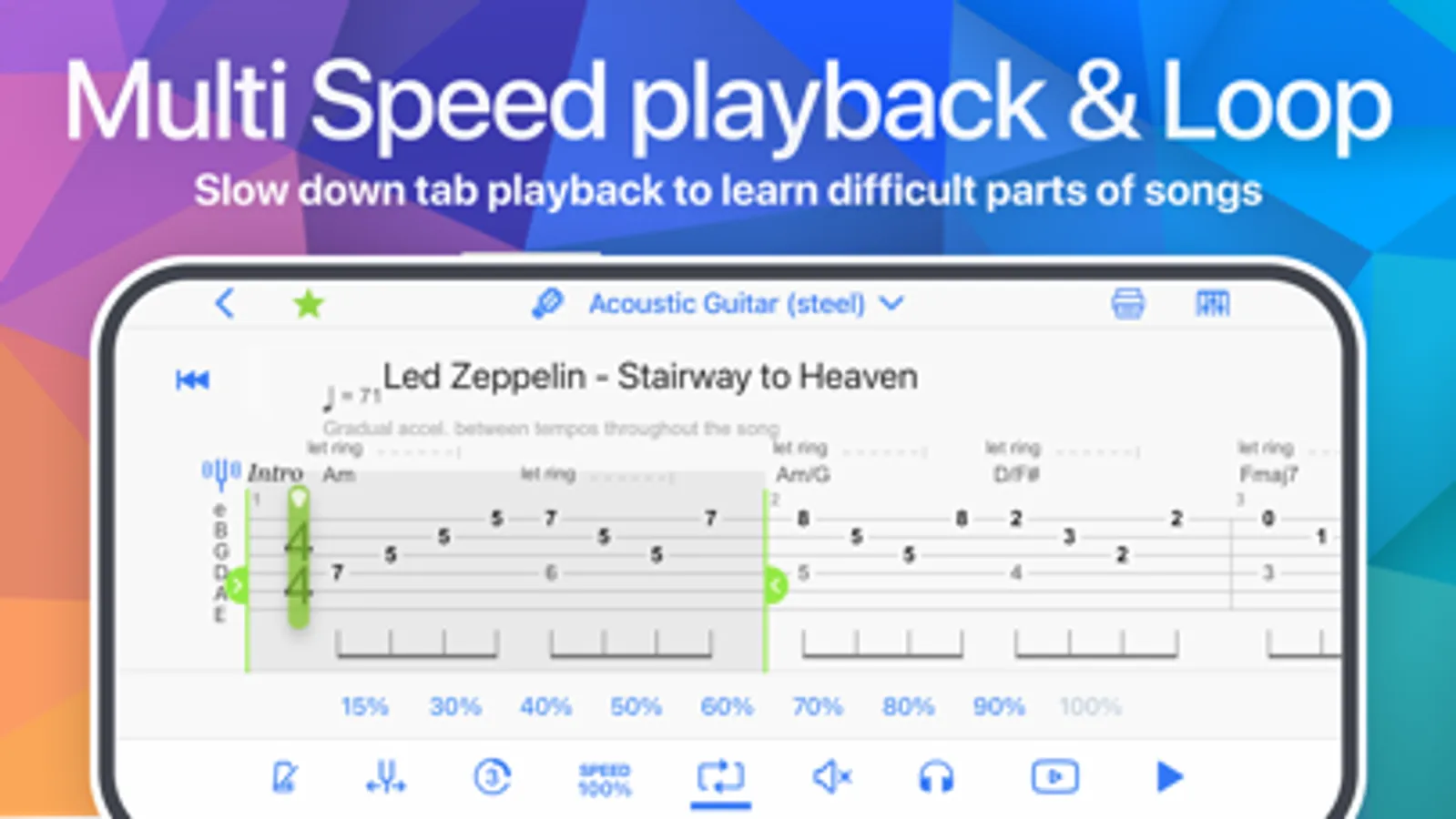 • Speed Control. Slow down tab playback up to 15% to learn difficult parts.