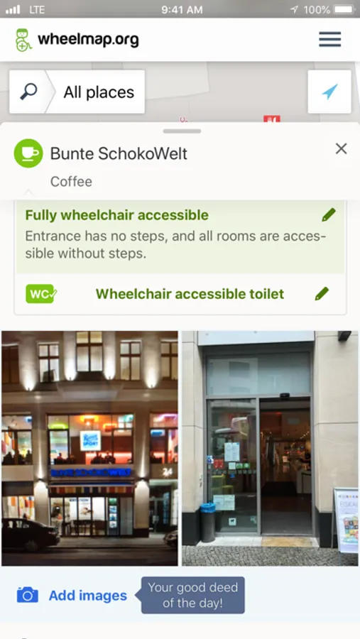 As with Wikipedia, you too can join in and contribute information about places worldwide. This is important, because in some regions of the world there are only a few entries at the moment. Help us improve the map: Rate the entrances and restrooms of public places according to their wheelchair accessibility and upload images of the places.
