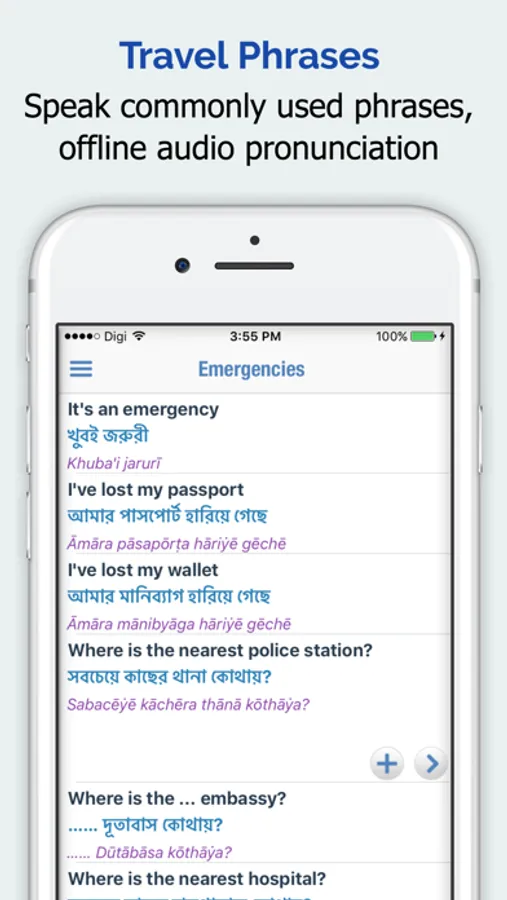 • Phrase book, Phrase of the day and Phrase Card helps to speak common phrases