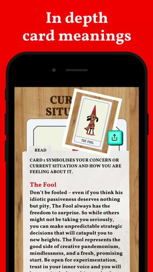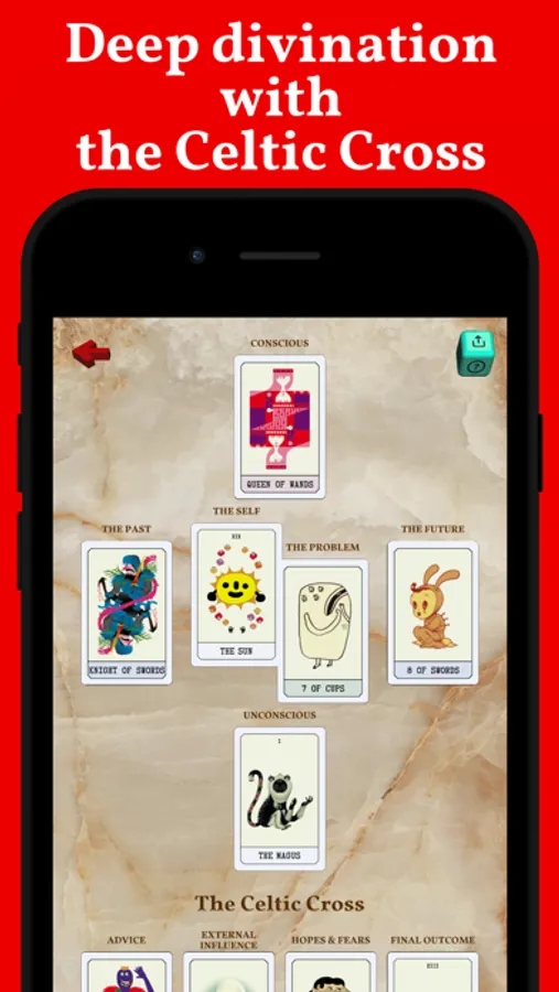 Simply pick the reading technique of your choice and the app will guide you through the divinatory process of revelation. Feel the magic of the cards while your finger gently swipes over the deck! Enjoy the dramatic revelation as the cards uncover their iconology! The app immediately provides each card's meaning, and, should you be in doubt, offers additional in-depth explanation.