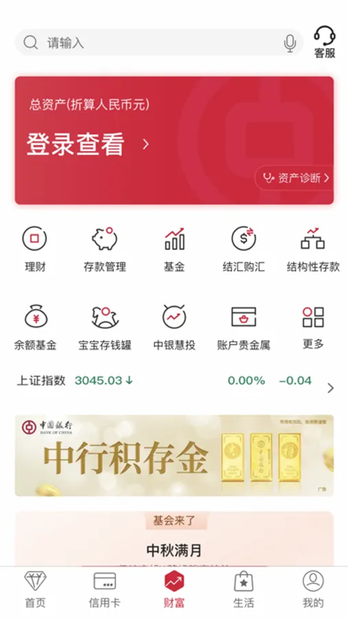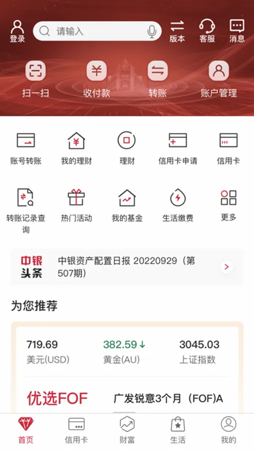 一键解锁,智富为您。8.0版推出财富管理开放平台,财富购物车、家庭财富全景视图、资产报告和资产诊断、甄选产品池、陪伴式服务、全方位安全保障六大王牌财富服务,通过专业、智能的财富管理能力,帮您管好“钱袋子”。