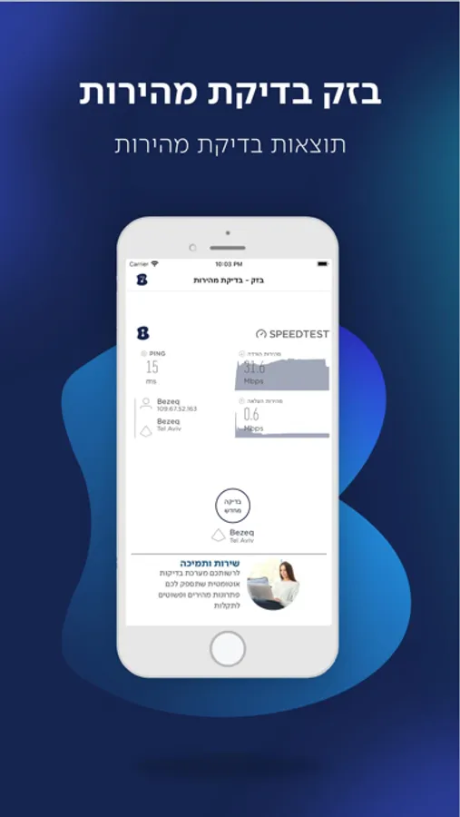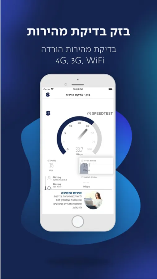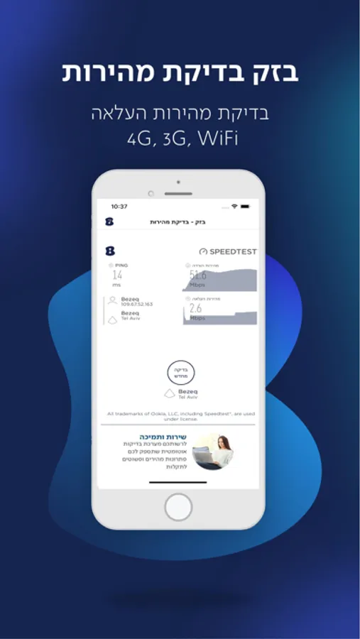 אפליקציה "בדיקת מהירות" מאפשרת לך לבדוק את מהירות הגלישה שלך דרך רשת אלחוטית (wifi) וברשת סלולארית.