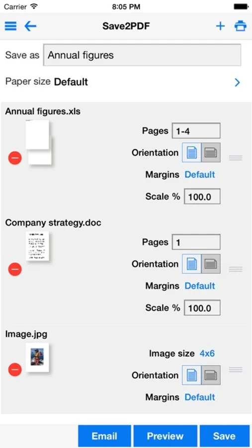 Save2PDF also enables easy merging of several documents into a single PDF, even if the files are completely different formats (i.e. create a single PDF by combining a document with a spreadsheet, or a Pages document with a Word file). It is also just as easy to merge multiple PDFs into a single PDF file.