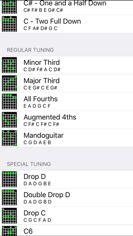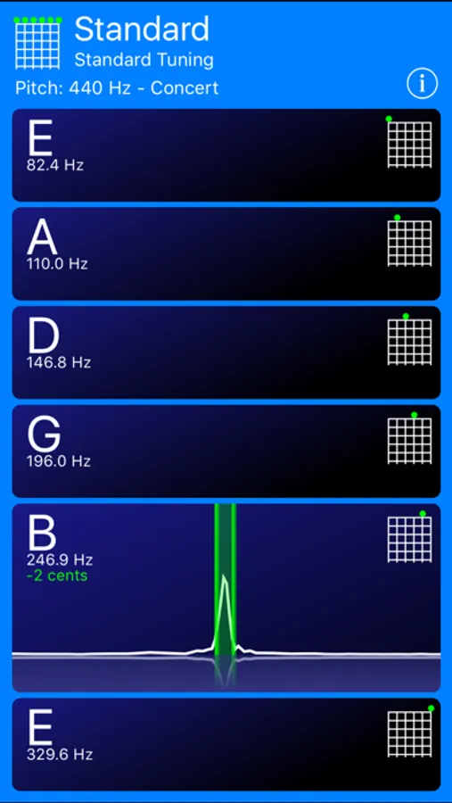 Provides a simple interface to visually check whether the pitch for each string is low or high, and lets you "see" the pitch change as you wind/unwind the string tuning machines. Tuning has never been easier.