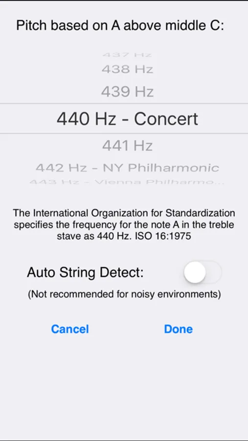 - Adjust pitch incrementally from 400 to 480 Hz or up/down a half/full step from A440. (The International Organization for Standardization specifies the frequency for the note A in the treble stave as 440 Hz. ISO 16:1975).