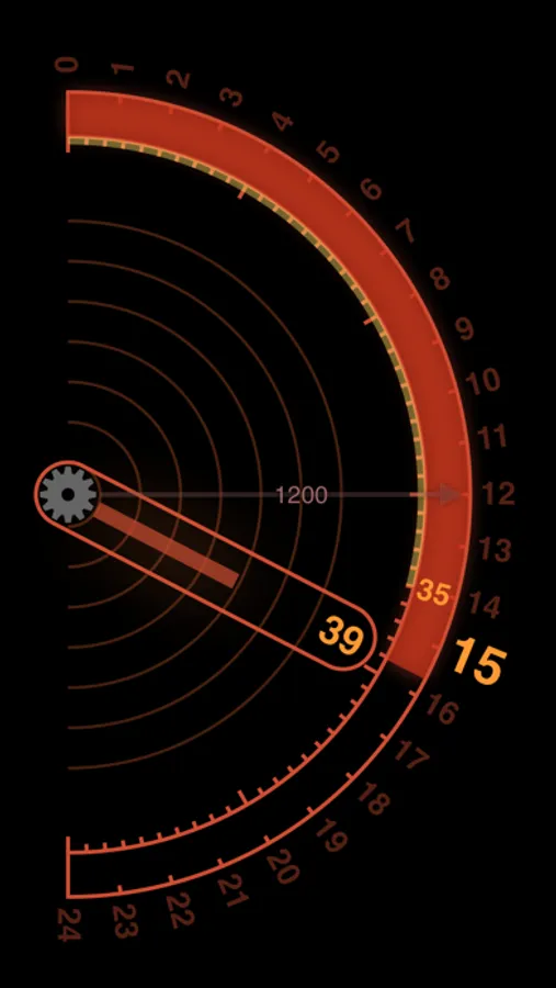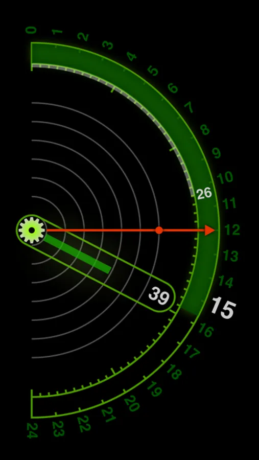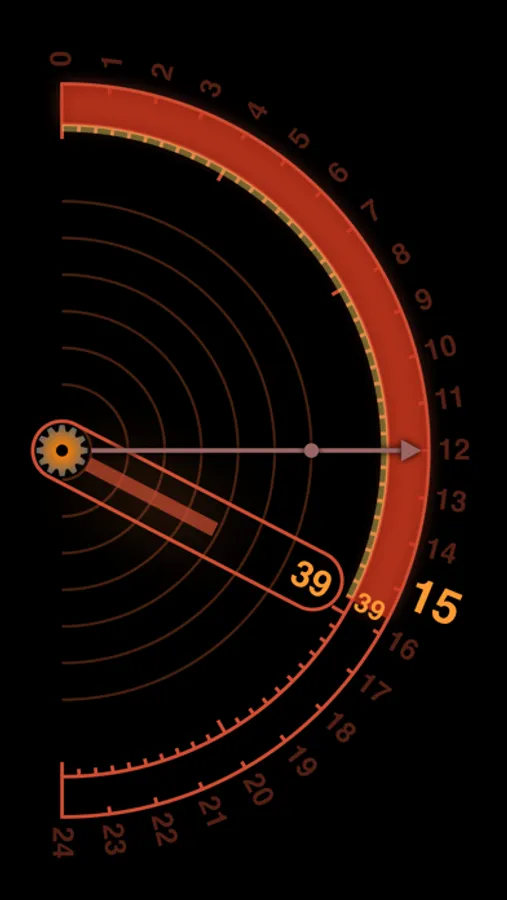 Tap the gear button to toggle the alarm on / off. To set the alarm time, with the alarm turned off, drag the alarm hand. Drag the alarm hand to indicate the time in 10-minute increments. Drag the gear button to display the setting screen. (Vertical display only)