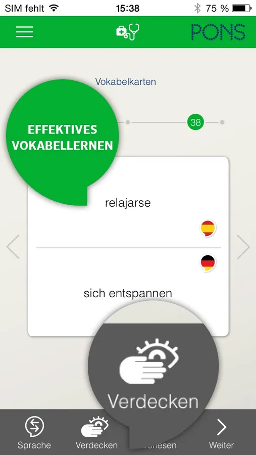 Mit der Möglichkeit eine Seite zu verdecken, trainieren Sie Ihren Wortschatz effizient und schnell.