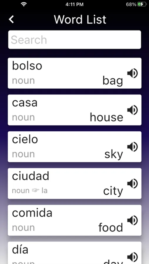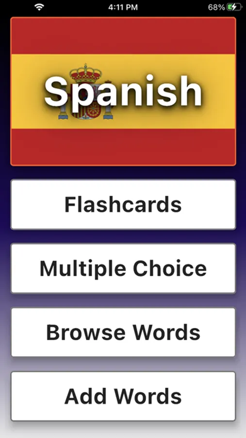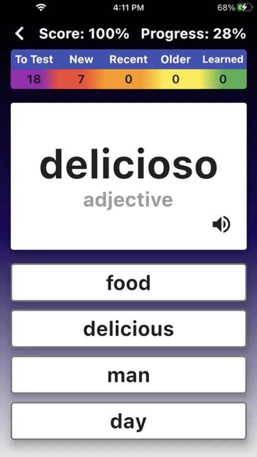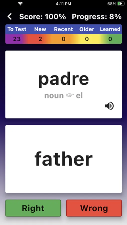 The app shows & speaks the Spanish word and you provide an answer. Then you see if you were right or wrong. But what makes this quiz SMART is the PROGRESS TRACKING in the background.