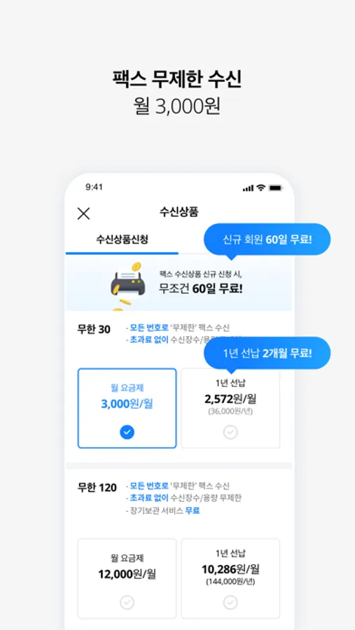 - 팩스수신: 월 3,000원에 무제한 수신 가능! (vat포함)