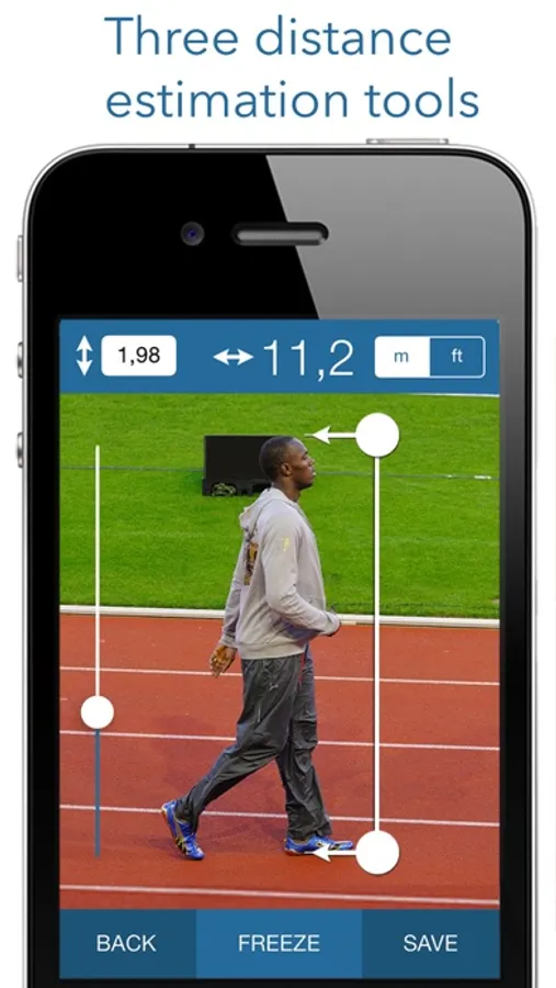 The stadimeter uses the size of a known object, e.g. a car, to calculate the distance. The clinometer uses your own height as reference, along with the angle of the iPhone, to estimate the distance to a point on the ground. The distances obtained from either tool can then be used to calculate the speed.