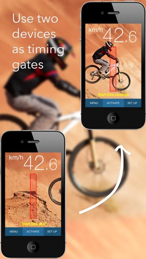 A third speed instrument uses two iPhone/iPads equipped with motion detection to start and stop the timer and measure the speed. The distance between the devices is used as reference, and the speed is calculated based on the time taken by the object to travel between the 'Start' and 'Stop' devices. The time is transmitted wirelessly over WiFi or Bluetooth.