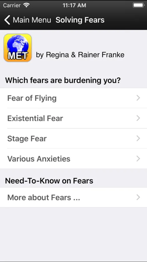 By means of this app and the MET-tapping therapy described here, you can solve these fears on your own, instantly and lasting. With the MET-app you will learn the Meridian-Energy-Techniques (MET) whereby fears and other negative feelings and thoughts can be dissolved in a moment and permanently by tapping certain acupuncture points with your fingertips.